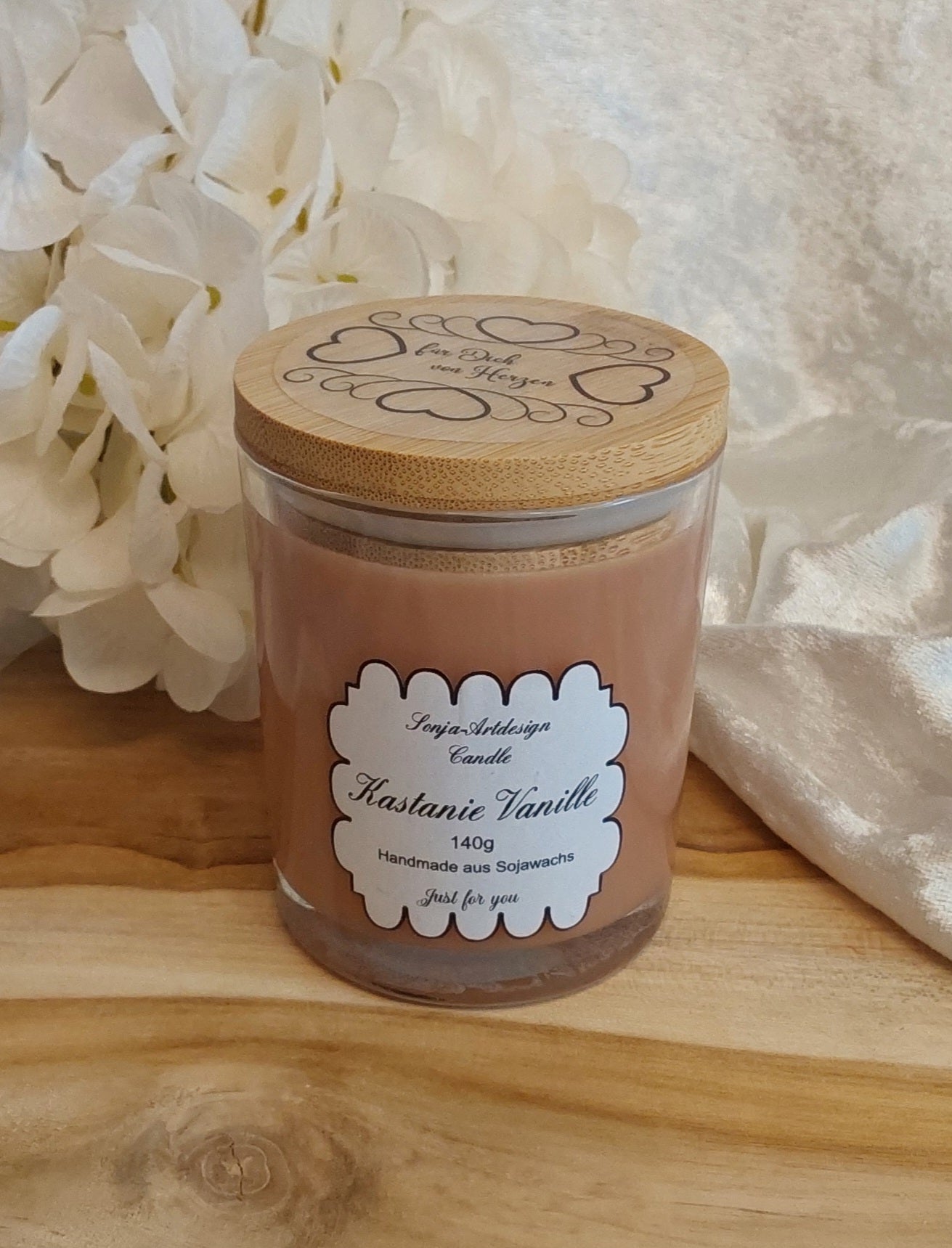 100% Sojawachs mit dem Duft Kastanie Vanille mit oder ohne weißer Geschenkbox.