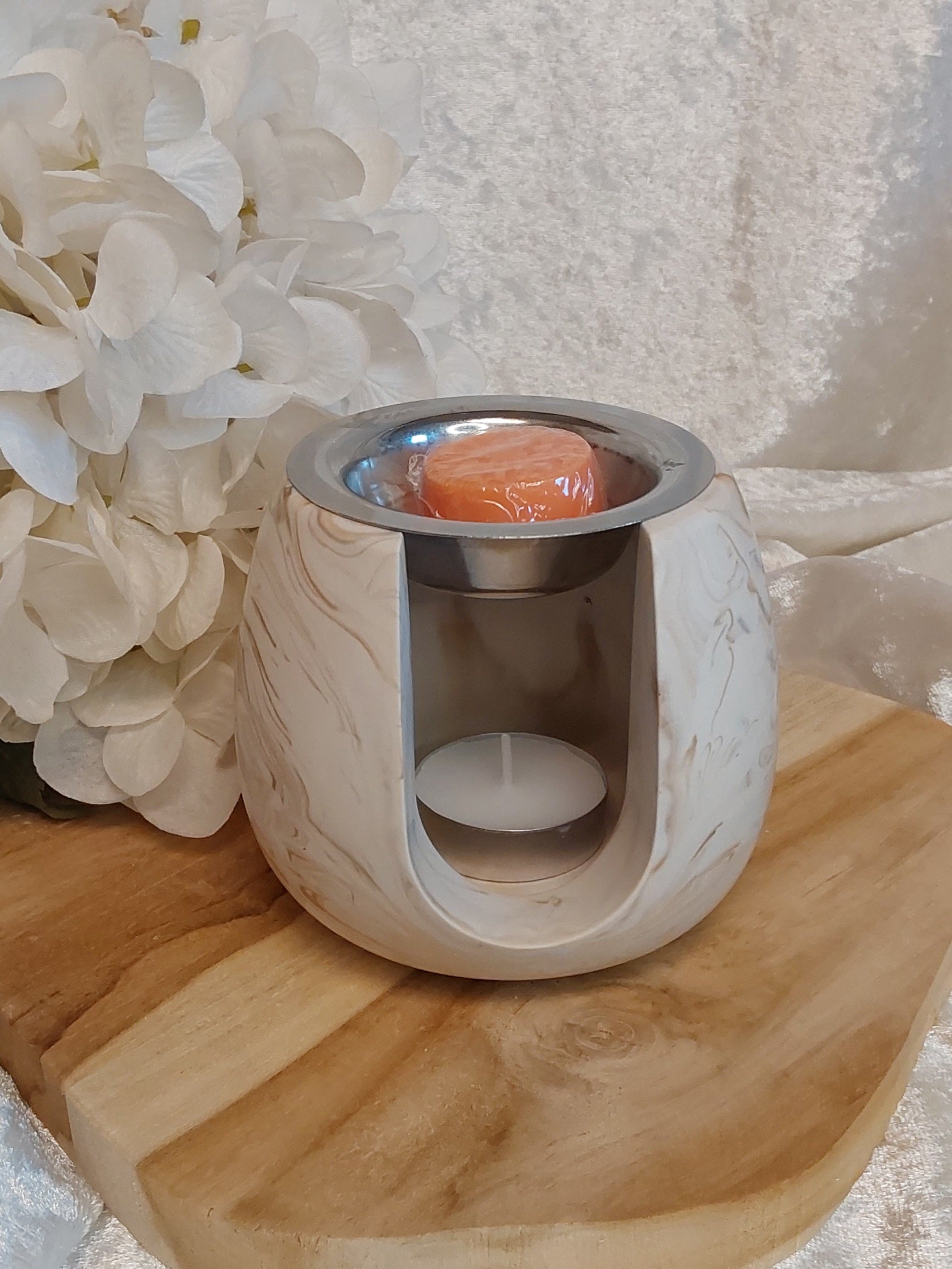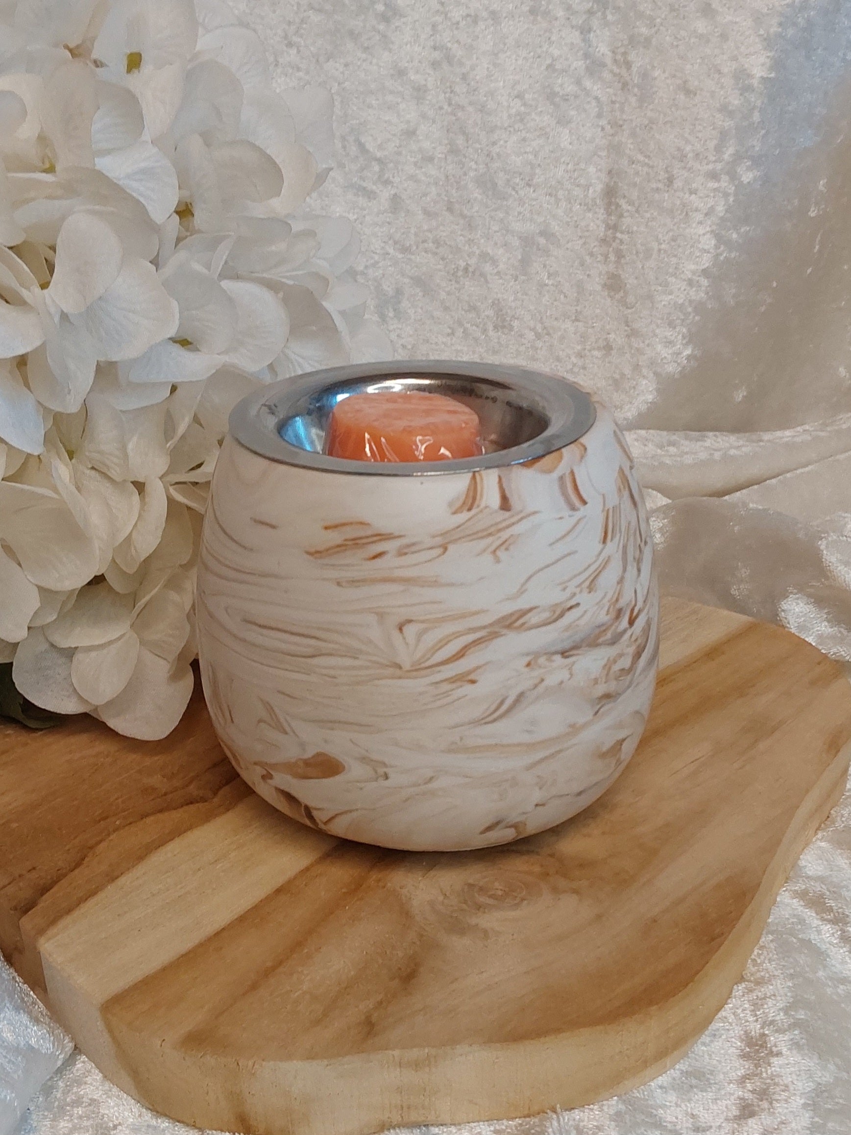 Duftstövchen aus Jesmonite. Beige/Braun meliert, mit Wachspfännchen und 1 Duftmelts damit du direkt Testen kannst.