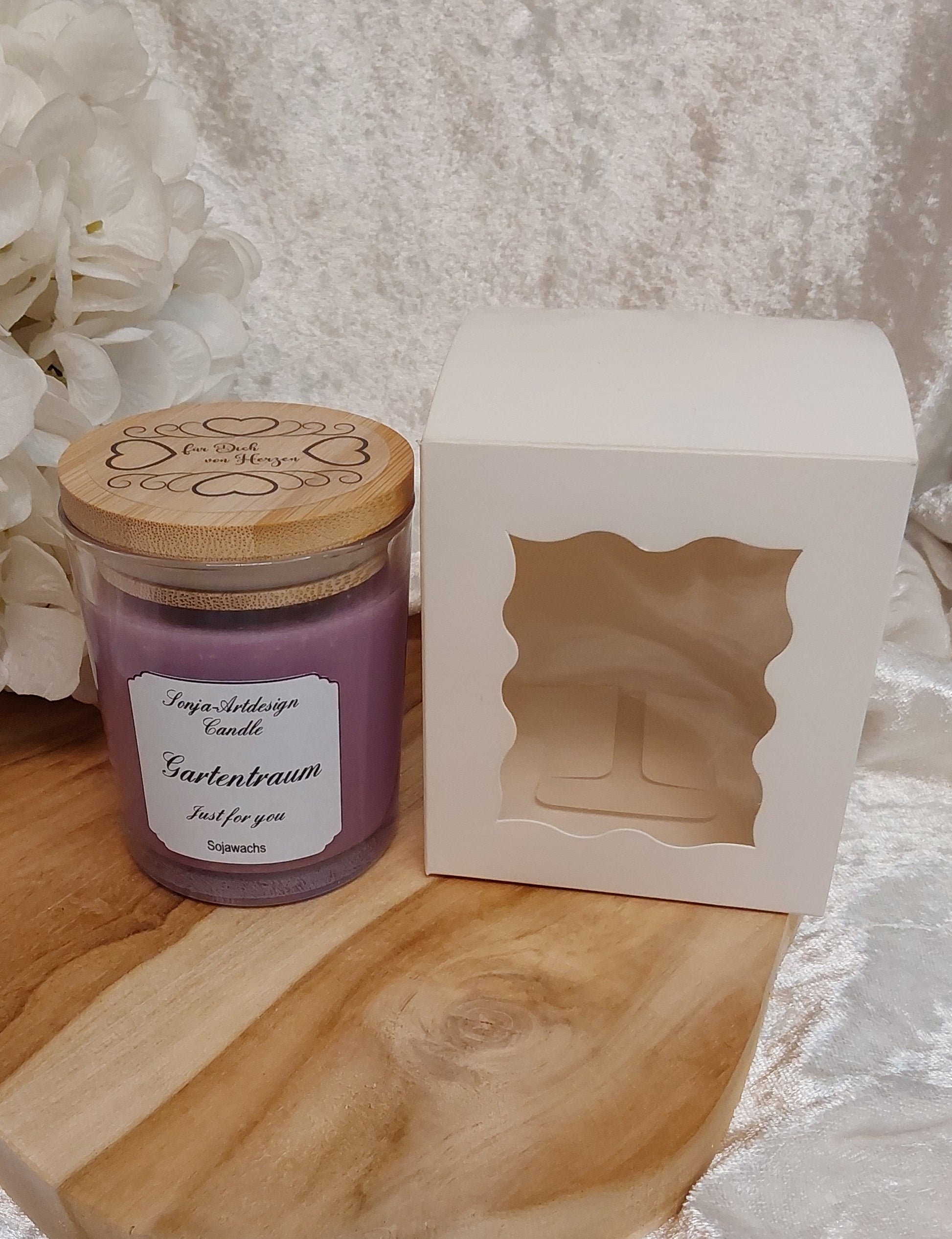 100 % Sojawachs mit dem Duft Gartentraum mit oder ohne Geschenkbox.