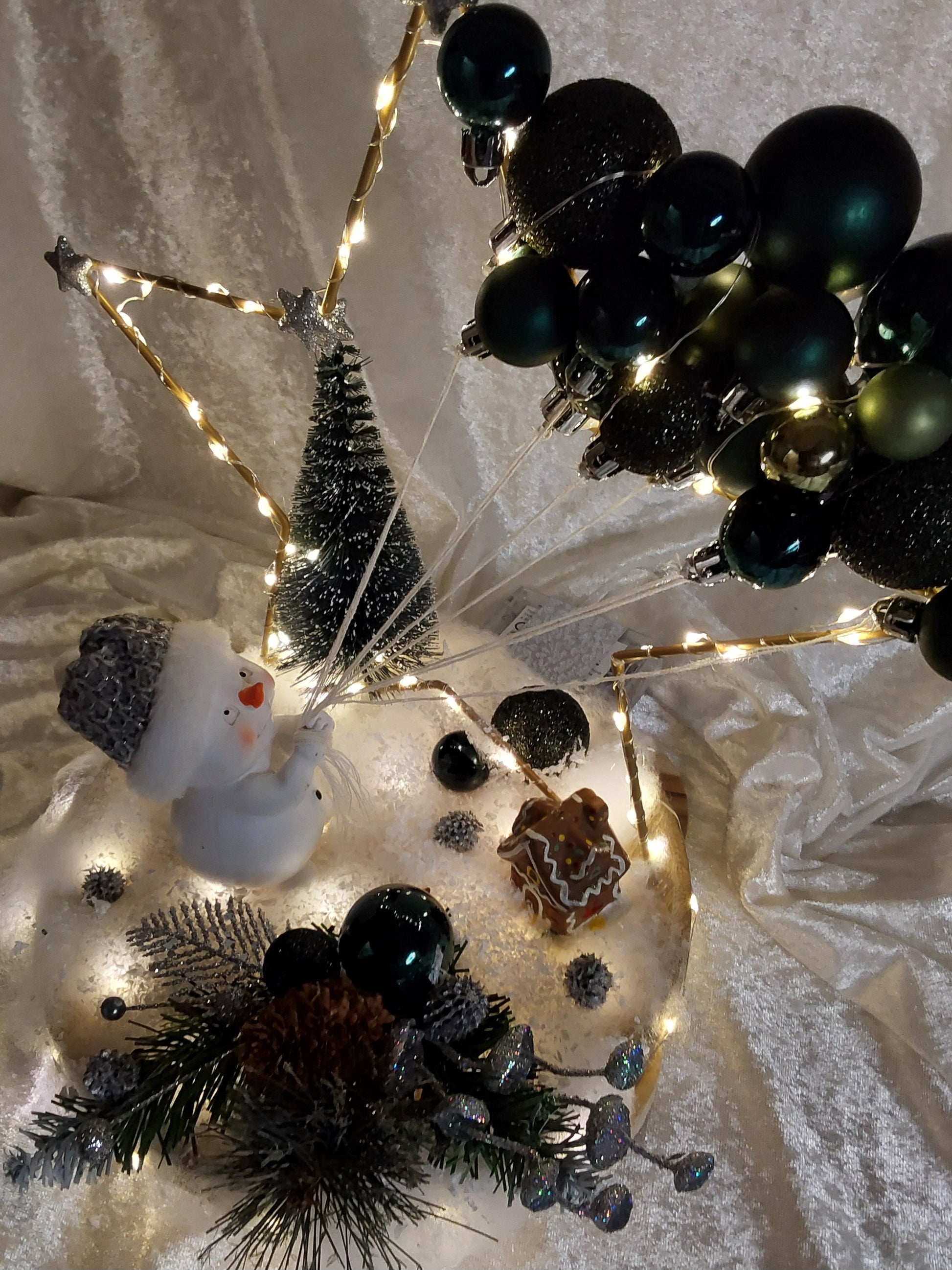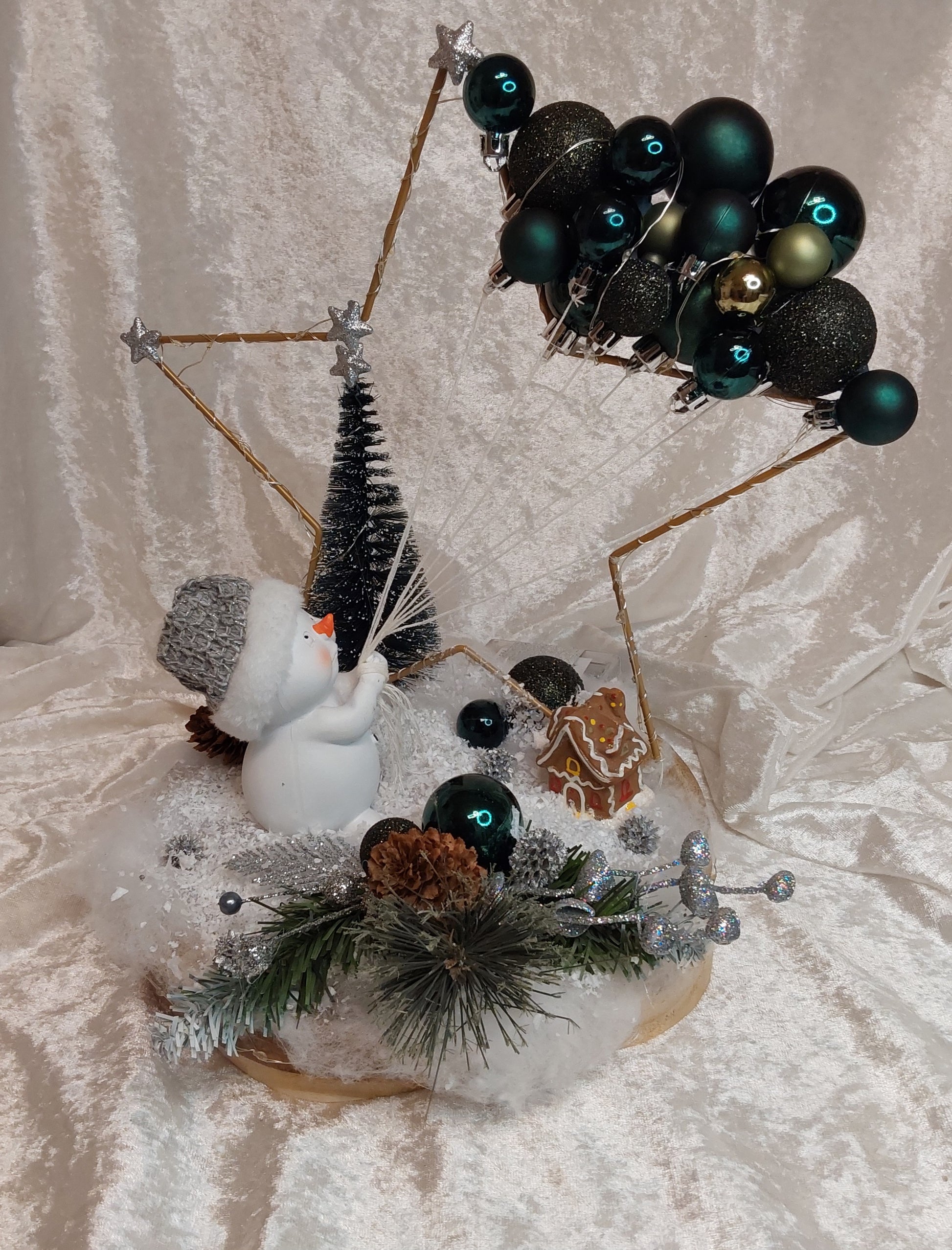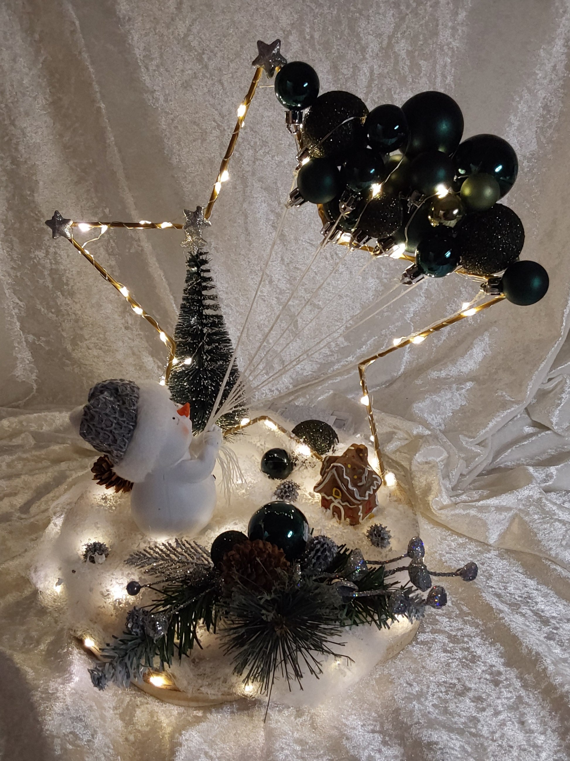 Schönes Gesteck auf einem runden Holztablett. goldener Stern mit Beleuchtung (Timerfunktion), Tannenbaum, niedlicher Schneemann, Kugeln am Stern, sowie weitere Weihnachtsdeko.