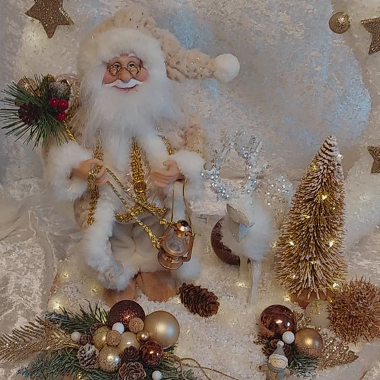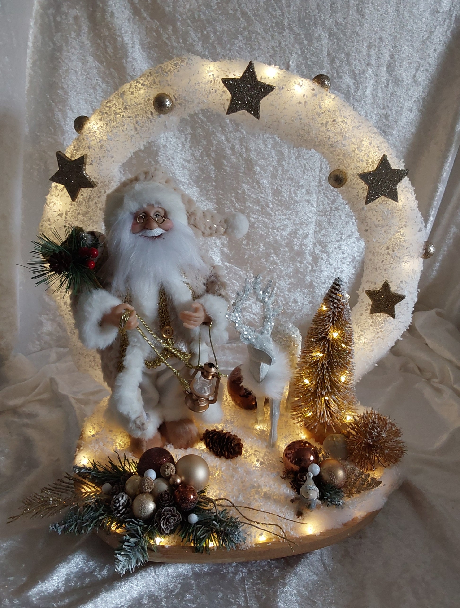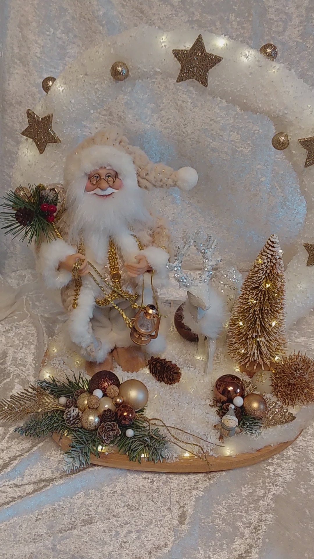 Wunderschöner Nikolaus in Rosa/Gold mit weichem Mantel. rosafarbiger Tannenbaum, weißem Rentier und weitere Weihnachtsdeko. Mit großem Ring und Sterne, alles mit Schnee bedeckt. Einfach traumhaft. Die Lichterkette ist mit Timerfunktion.