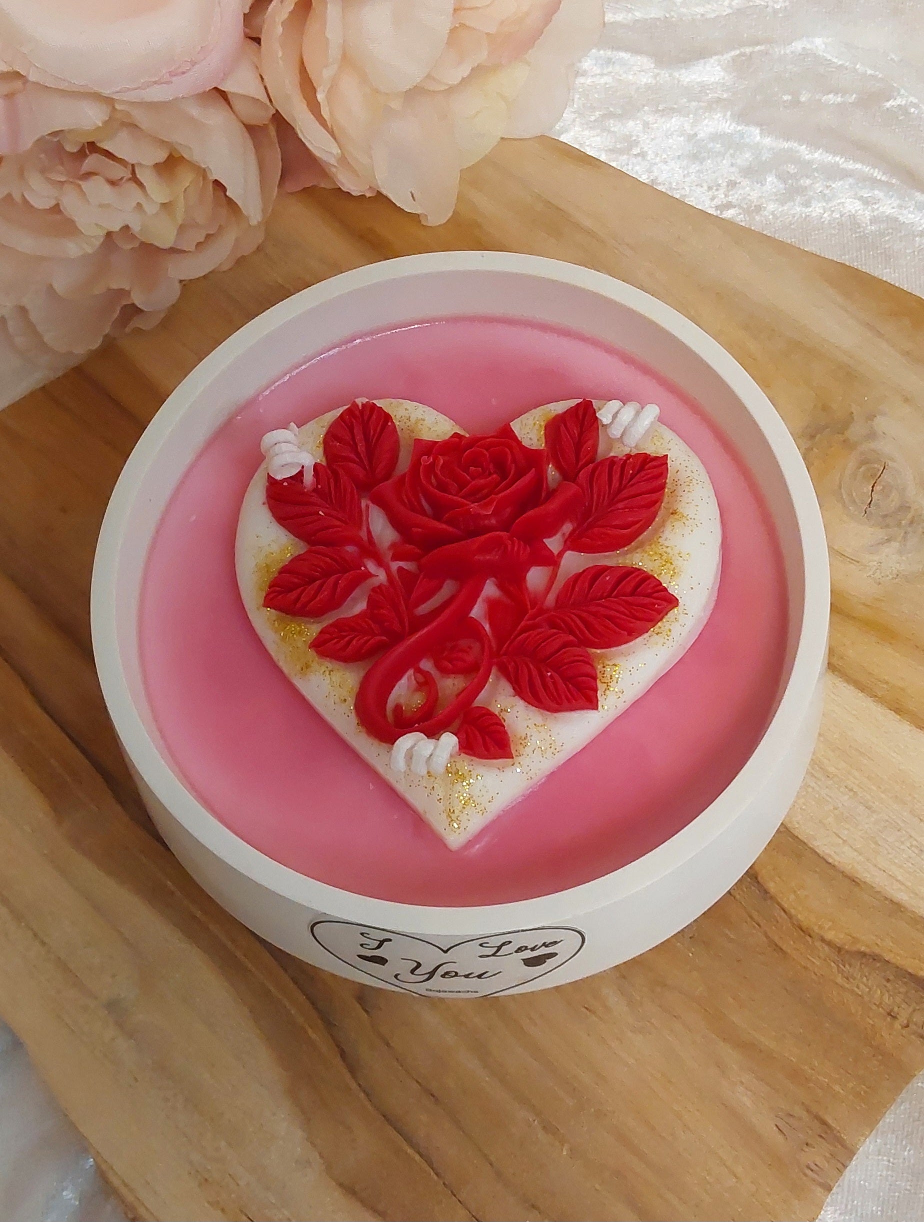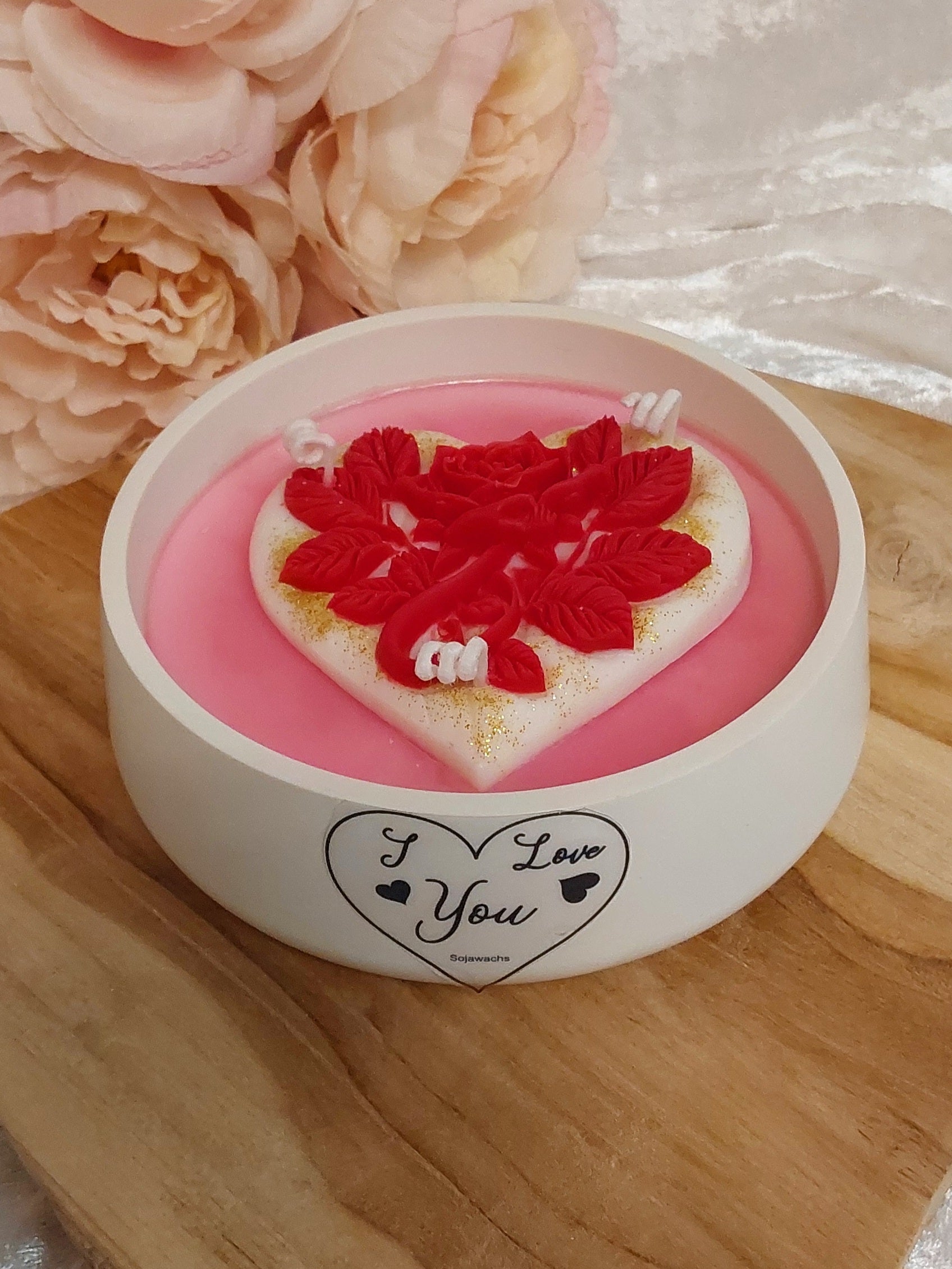 I Love You-Kerze. Bestens für den Valentinstag oder Muttertag. Mit schönem Herz und einer roten Rose. Mit einem wunderbaren Duft. Darüber freut sich dein liebster Mensch.
