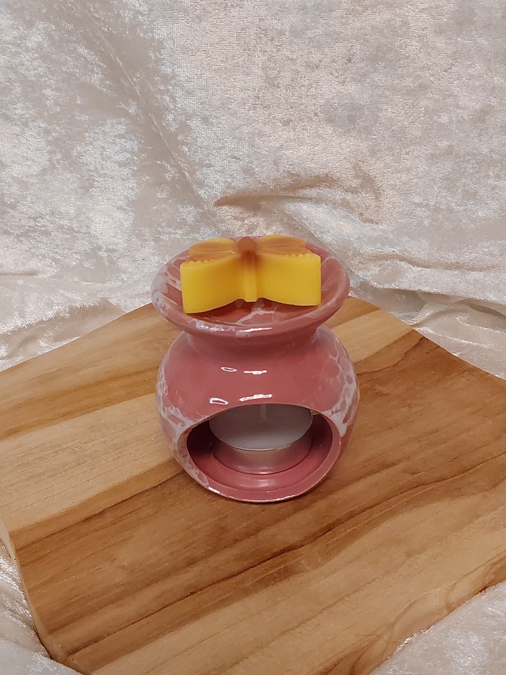 Niedliches, kleines Stövchen in Altrosa und weiß marmoriert aus glänzendem Keramik mit integrierter Wachsschale. Ein schöner Style für wenig Platz. Die Form ist ein Lichtblick. Im Wohnzimmer, Schlafzimmer usw. einfach stylisch in jedem Raum.