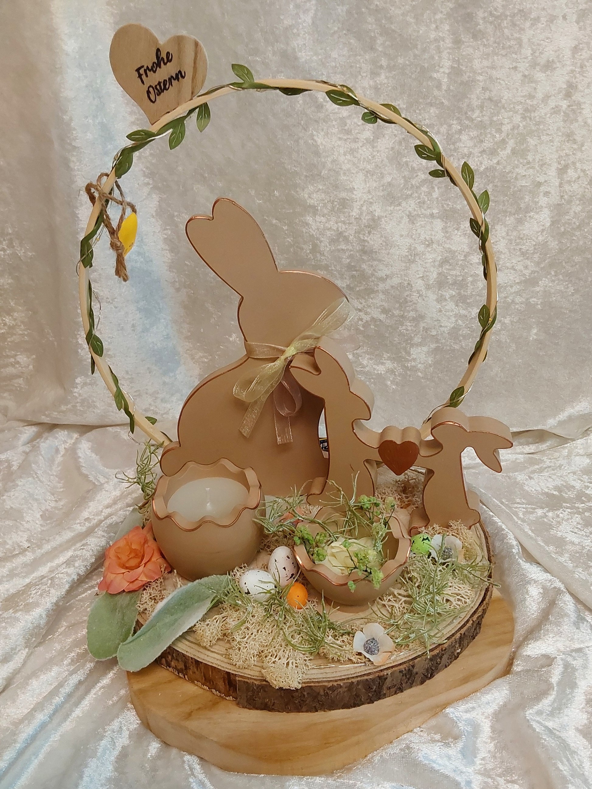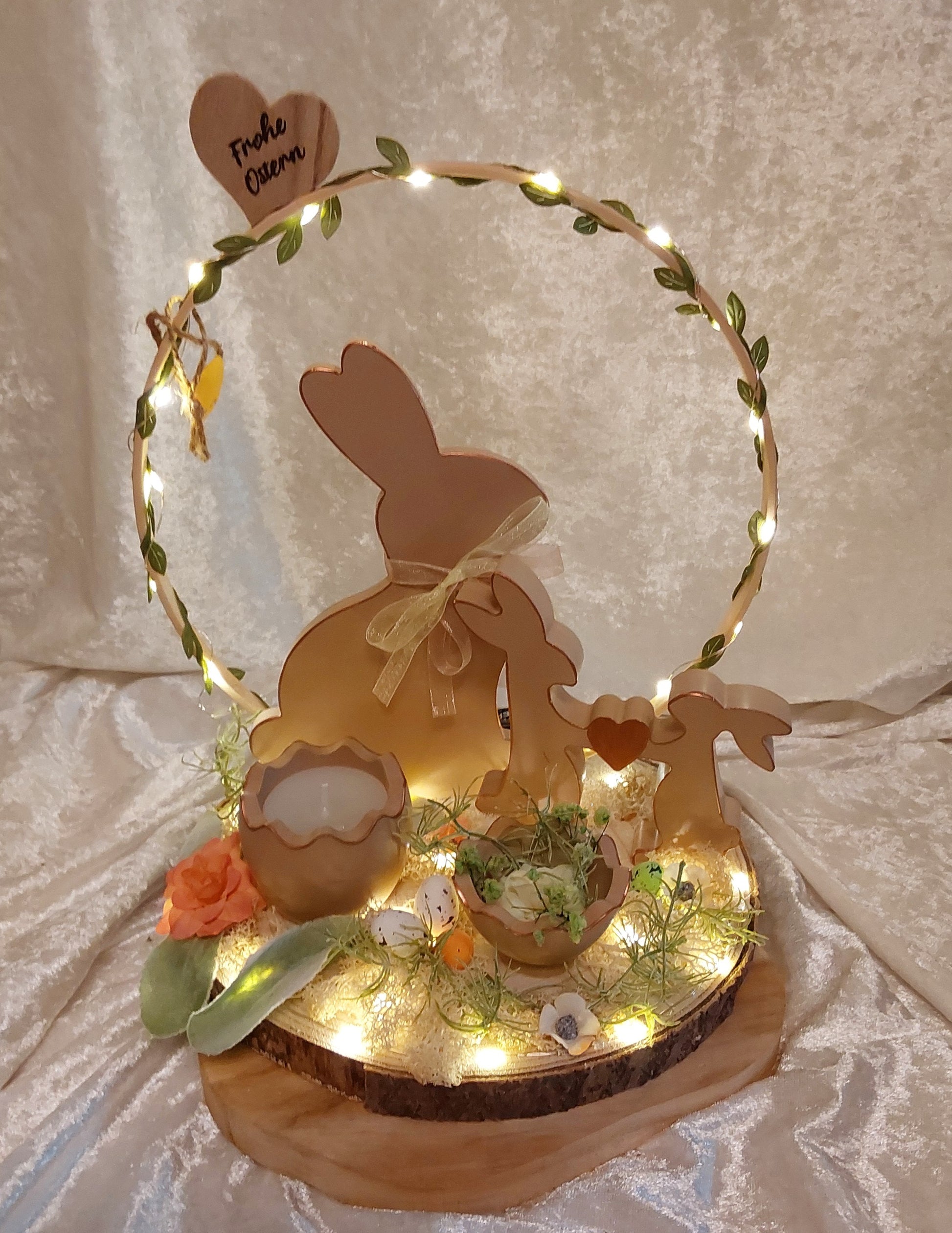 Oster-Deko in Braun mit Beleuchtung auf einem Holztablett. Auf dem Tablett ist ein Holzkranz befestigt der beleuchtet ist. In Braun befinden sich zwei Hasen, eine Kerzen in Eierschalenform, eine Eierschale mit Blüten, sowie weitere Dekorationen.