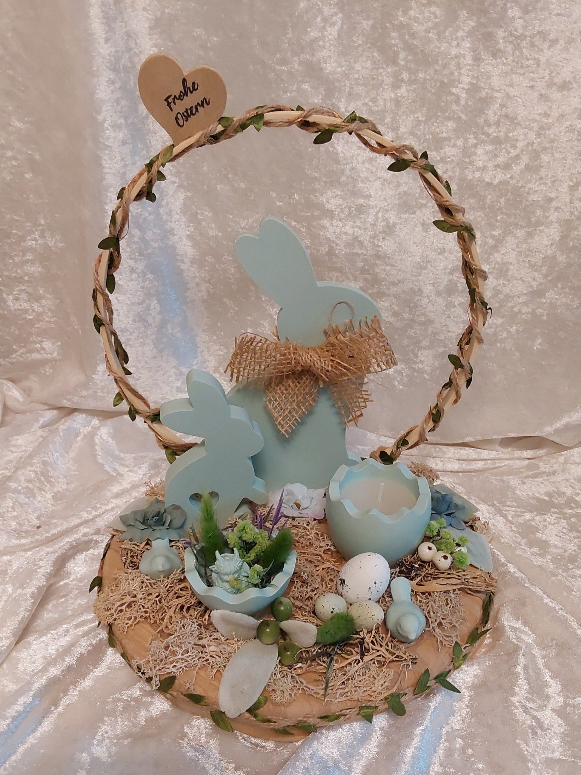 Oster-Deko in Hellgrün mit Beleuchtung auf einem Holztablett. Auf dem Tablett ist ein Holzkranz befestigt der beleuchtet ist. In Hellgrün befinden sich zwei Hasen, eine Kerzen in Eierschalenform, eine Eierschale mit Blüten, sowie weitere Dekorationen.