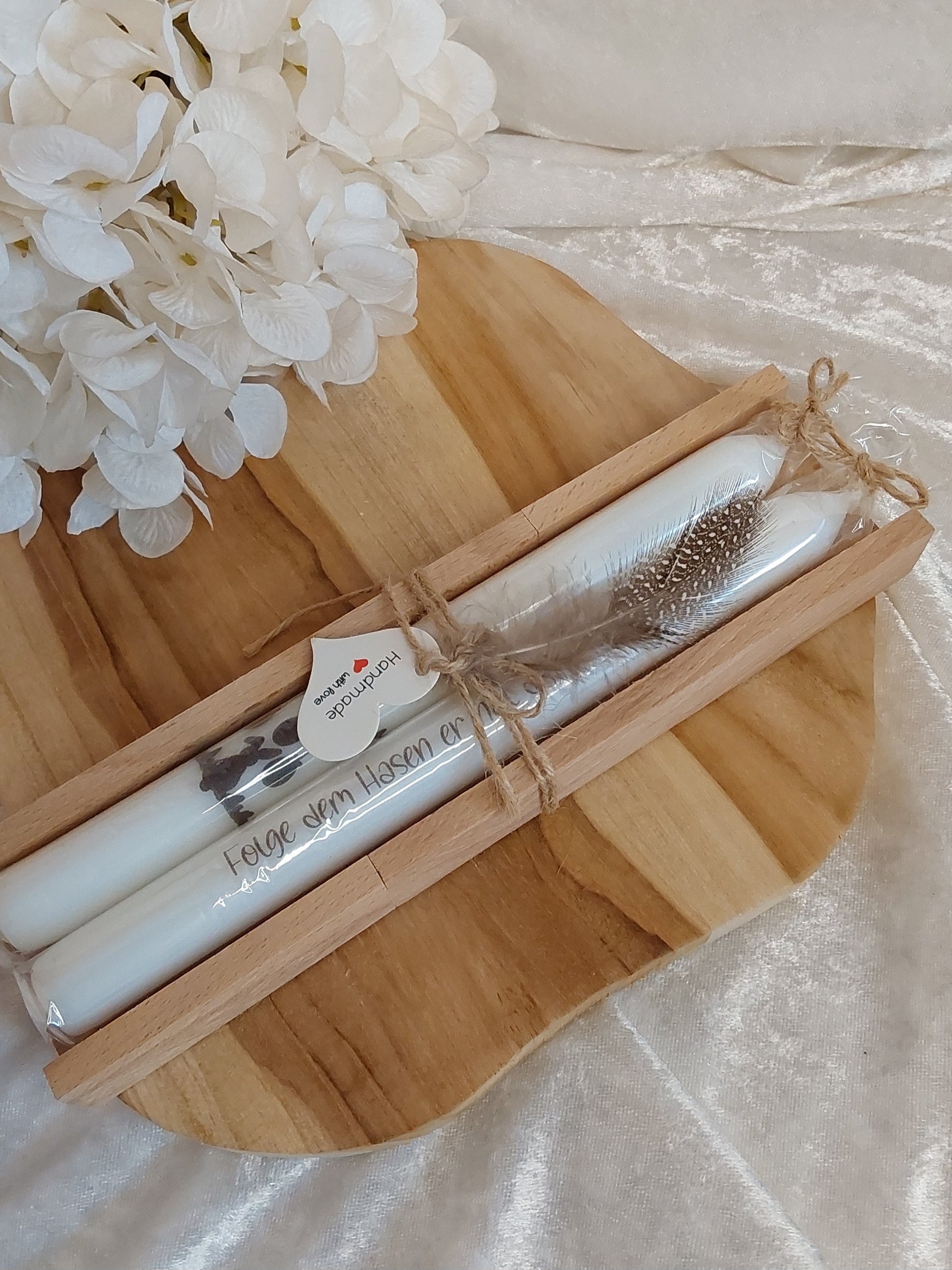 Geschenk-Set. 2 Stabkerzen in Holz verpackt. Kerzen sind aus Paraffin.